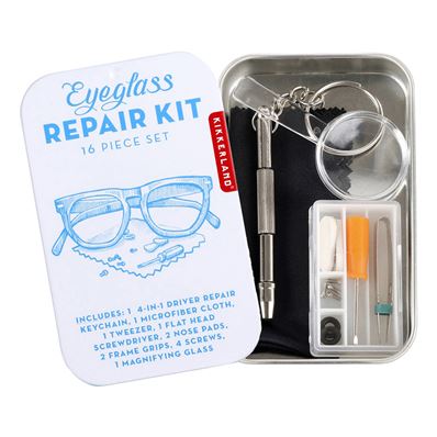 Ce kit de réparation de lunettes d'urgence Kikkerland contient tout ce dont vous avez besoin pour une réparation rapide des lunettes. L'ensemble comprend un couvercle en métal qui contient un porte-clés de réparation de pilote 4 en 1, un chiffon en microfibre, une pince à épiler, un tournevis à tête plate, des plaquettes de nez, des poignées de cadre, des vis et une loupe.