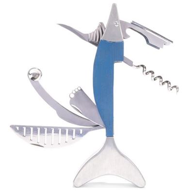 Canif tire-bouchon poisson Avec cet outil multifonctions, vous ne manquez plus de rien dans votre cuisine. Et ça tient dans une poche ! Ce tire-bouchon en forme de marlin (gros poisson tropical). Les fonctions du canif sont les suivantes : lame de couteau, cuillère doseur (15 ml), zesteur, mélangeur et passoire à cocktail, tire-bouchon et décapsuleur. Matériaux : alliage de zinc, acier inoxydable, bois de frêne. Dimensions : 19 x 7,6 x 4 cm.