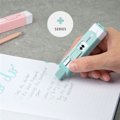 Combinaison d’une gomme à effacer avec un taille-crayons avec réservoir. Design STICK série Édition +, couleur turquoise. Le corps du produit inclut un biocide. Le biocide est un verre au phosphate d'argent (CAS 308069-39-8) avec effet antibactérien.