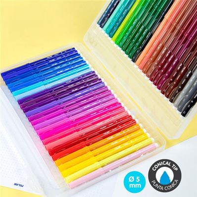 Feutres à pointe conique 5 mm Ø qui permet de réaliser des traits de 0,75 mm à 3 mm. Pointe résistante aux coups et à la pression. Encre à based’eau. Fournit des couleurs brillantes, facilement applicables et mélangeables entre elles. Son type de pointe est conseillée pour remplir des surfaces de couleurs. Facilement lavable sur la plupart des textiles (mouiller le tissu dans de l’eau froide pendant une heure et laver en machine, à l’eau froide également). Avec capuchon de sécurité ventilé. 50 couleurs. Mallette rigide avec dessin enfantin.