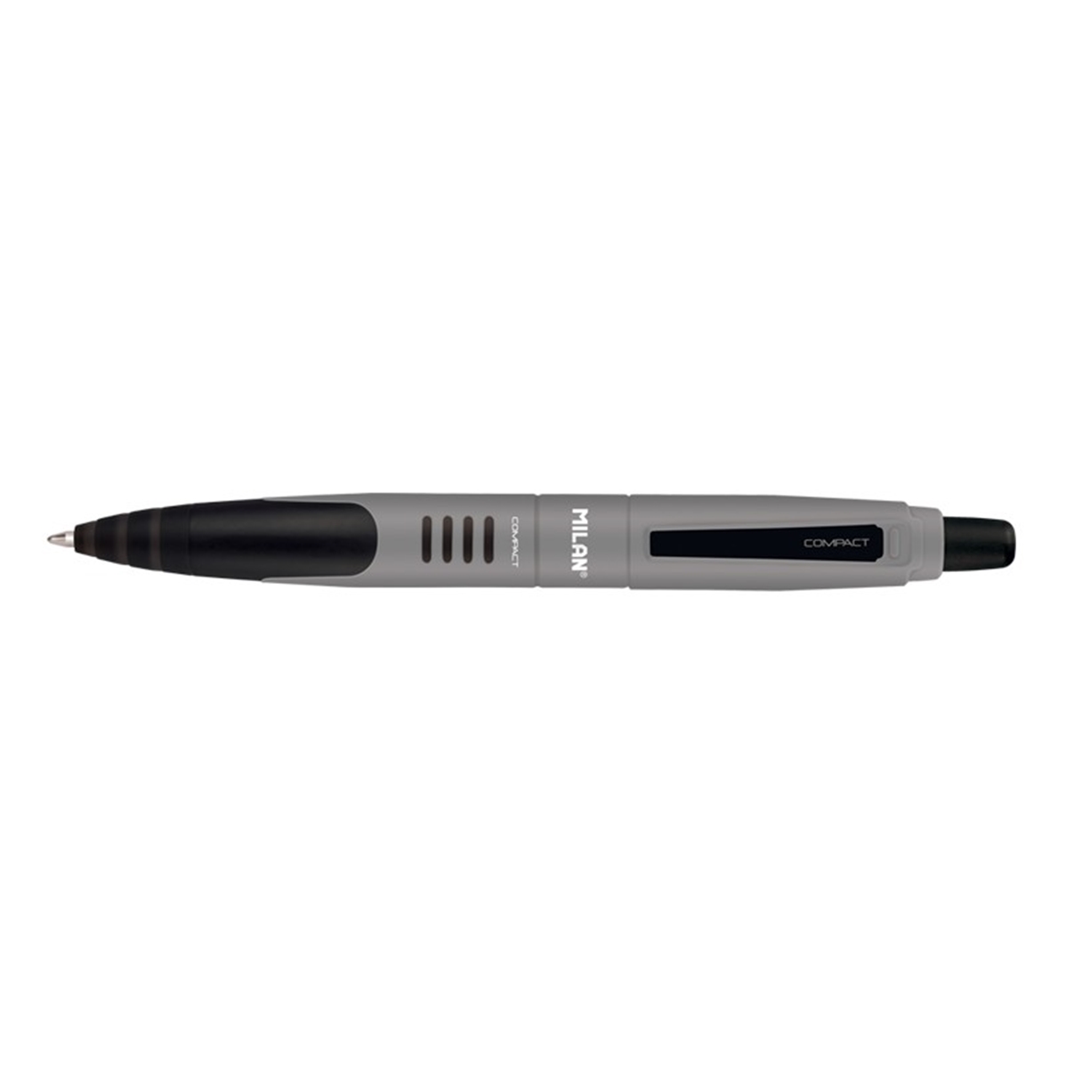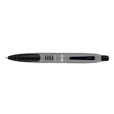 Stylo COMPACT noir. Longueur d’écriture approximative de 1000 mètres. Pointe 1 mm. Encre fabriquée en Allemagne. Poussoir à retour. Design original conçu par le département R+D de MILAN. Dimensions du stylo: 14.1 x 1.7 cm. 1.4 cm Ø.
