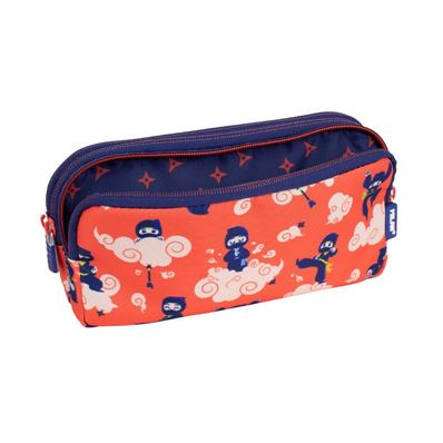 Trousse 3 fermetures éclair. Trousse avec 3 grands compartiments pour pouvoir répartir le contenu. Série spéciale Ninjutsu, des ninjas silencieux et amusants sautent sur les nuages. Motifs imprimés sur un fond de couleur rouge avec des nuages couleur crème et des détails bleu marine. Doublure intérieure de couleur bleu marine avec des dessins de petites étoiles shuriken. Composition tissu : extérieur et doublure intérieure en polyester. Dimensions : 22 x 11 x 6,5 cm.
