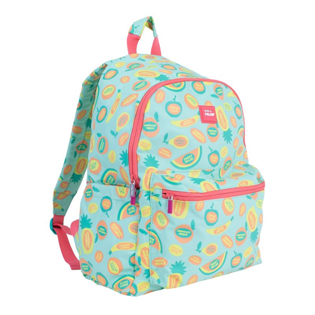 Sac à dos urbain classique avec 2 fermetures éclair. Série spéciale Frutikis, une drôle de salade de fruits aux couleurs fraîches et tropicales. Sur un fond vert avec des détails de couleur corail et une doublure de couleur fuchsia. Une poche principale avec compartiment intérieur protecteur pour ordinateur portable. Poche avant et deux poches latérales avec velcro faciles d'accès.