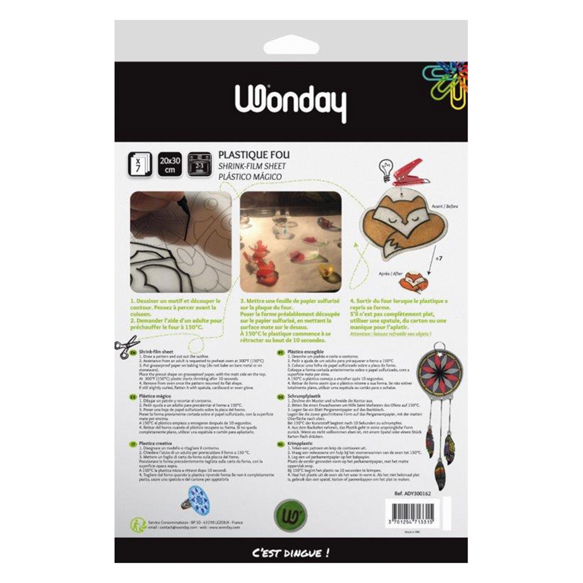 Sachet de Plastique fou comprenant 7 feuilles Cristal 20 x 30cm. Ce produit est Connu aussi sous le nom de Plastique dingue ou Magique, ces feuilles Cristal vous permettront de créer: Broches, porte-clefs, boucle d'oreilles, magnets, guirlande, marque-pages, boutons, bijoux...Dessinez un motif sur votre feuille, coloriez avec des feutres permanents et découper le contour. Préchauffer le four entre 150 et 180°. Au contact de la chaleur pendant environ 3 minutes le plastique fou se tord et se rétrécit jusqu'à 7 fois sa taille. Après cuisson il devient 7 fois plus petit et 7 fois plus épais. Il est donc très important de prévoir une taille bien plus importante. En sortant du four s'il n'est pas complètement plat utiliser une spatule pour l'aplatir.